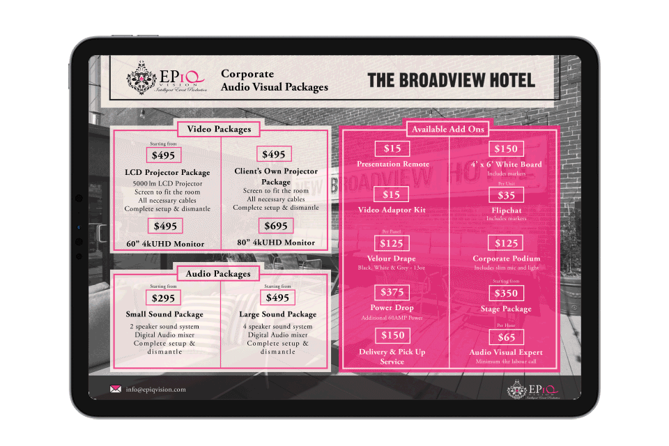 EPiQVision contacted me looking for help with their sale sheets for the services that they provide for Evergreen Brickworks, the Broadview Hotel, and the Globe and Mail Centre in Toronto, CA